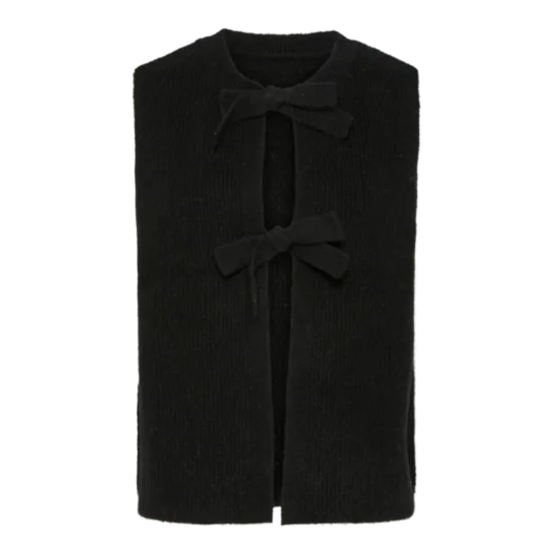 Super sød strik vest fra Pieces. Vesten har rund halsudskæring og lukkes med to bindebånd som en sløjfe.