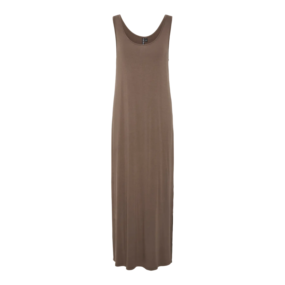 Lang, løs kjole med stropper, rund hals og slids i begge sider, fra Pieces.