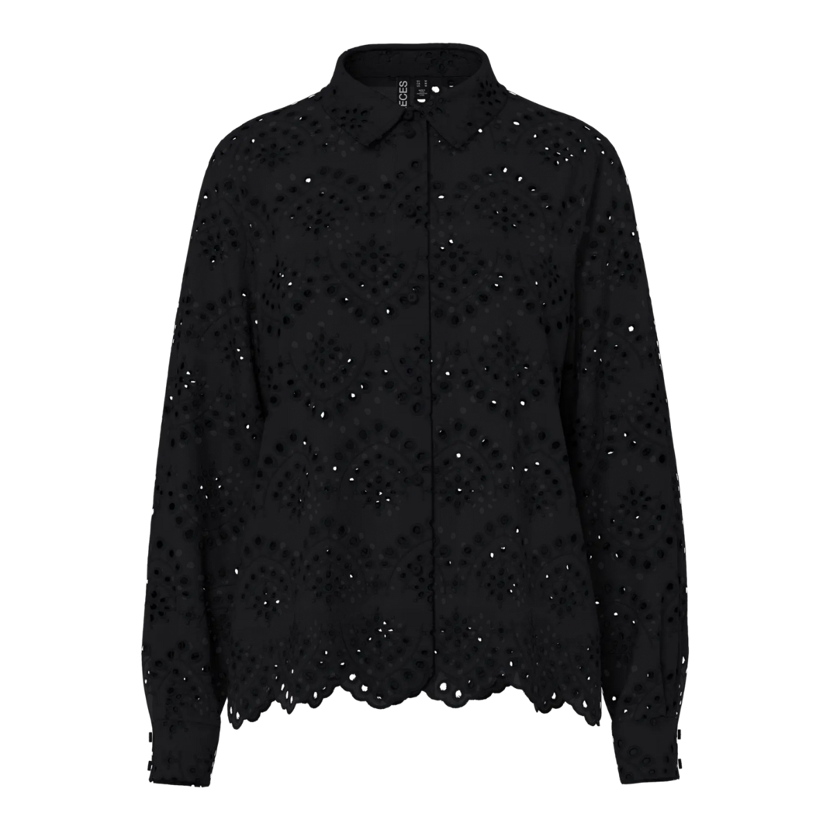 Flot skjorte fra Pieces. Skjorten er gennemknappet, har en klassisk skjortekrave samt lange ærmer. Derudover er der et hulmønster fordelt på hele skjorten.