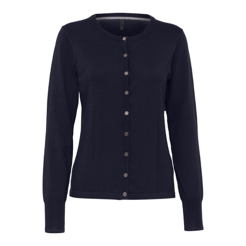 Fin cardigan af lækkert strik. Cardiganen har længe ærmer, en rund halsudskæring og er gennemknappet Materiale: 80% Viskose 20% Polyester Vaskeanvisning: Vaskes ved 30 grader