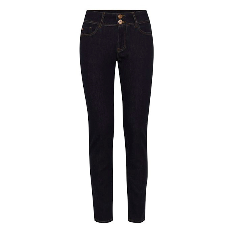 Fede, tætsiddende jeans med en smule stræk. Buksen har fem lommer og knapper i bronzefarve.