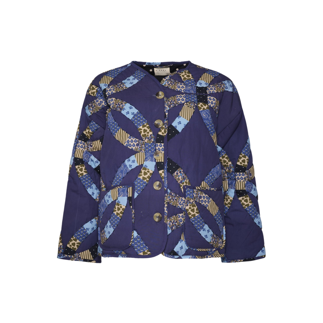 Skøn, casual jakke i et feminint udtryk. Jakken er kviltet og har et smukt cirkulært mønster med forskellige print. Derudover har jakken lange ærmer og to lommer foran. Lukkes med knapper. En S/M måler 66 cm i længden og 132 cm i brystmål. En M/L måler 68 cm i længden og 138 i brystmål.