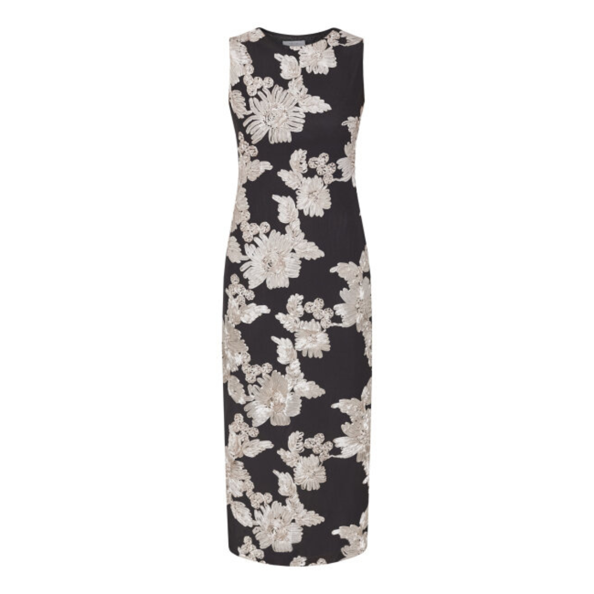 Flot kjole fra SisterS Point. Kjolen har en rund halsudskæring samt et flot blomster design fortil. Materiale: Yderstof: 95% Polyester. 5% Elastan. Lining: 100% Polyester. Vaskeanvisning: Vaskes i hånden.