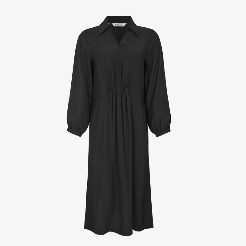Skøn kjole med fine detaljer. Detaljerne er på maven og ved ærmerne. Den har krave, samt en v-udskæring. Kjolen har lommer og pasformen er løs.