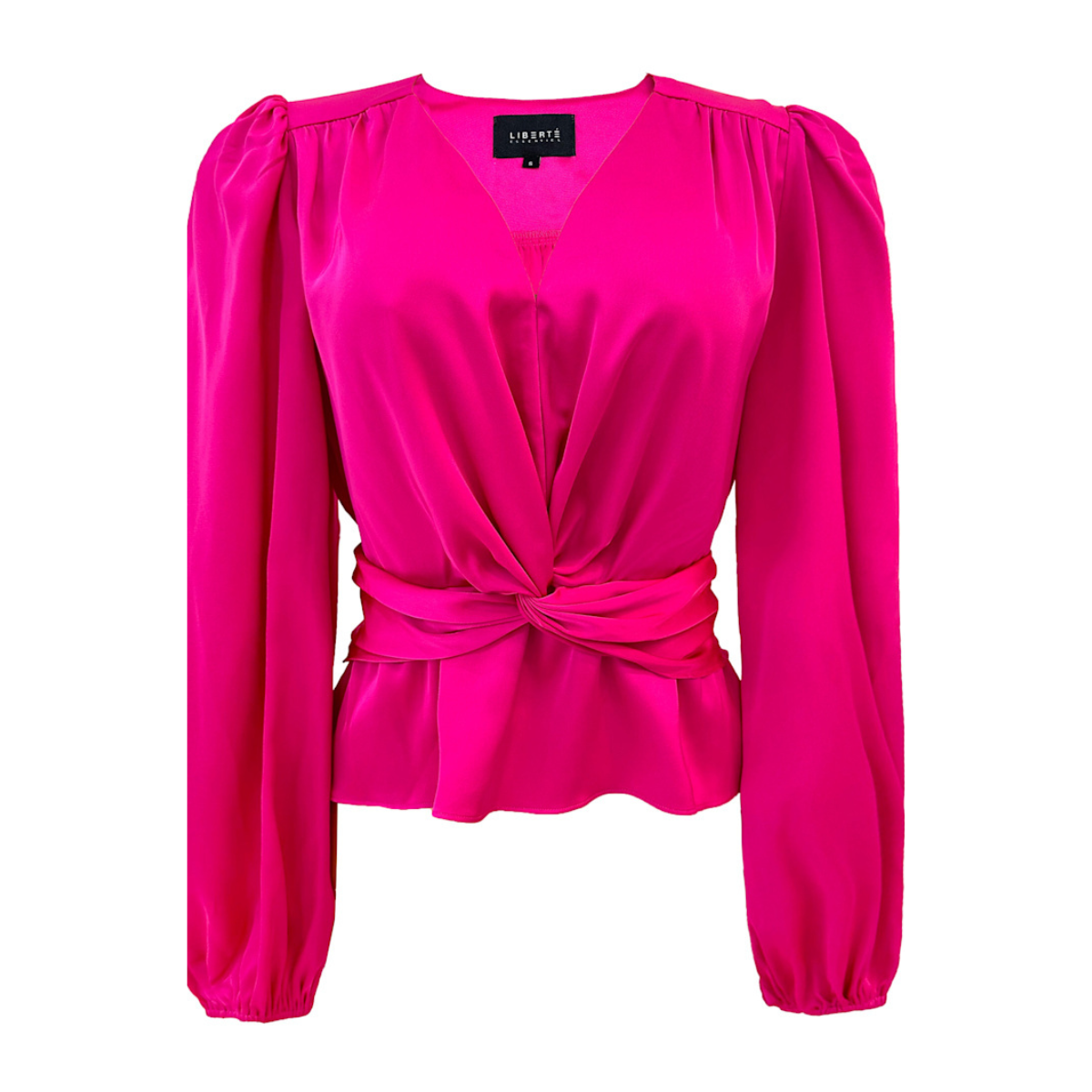 Super sød bluse fra Liberté. Blusen har lange ærmer med elastik ved håndledet, V-udskæring samt en fin snoet detalje ved taljen.