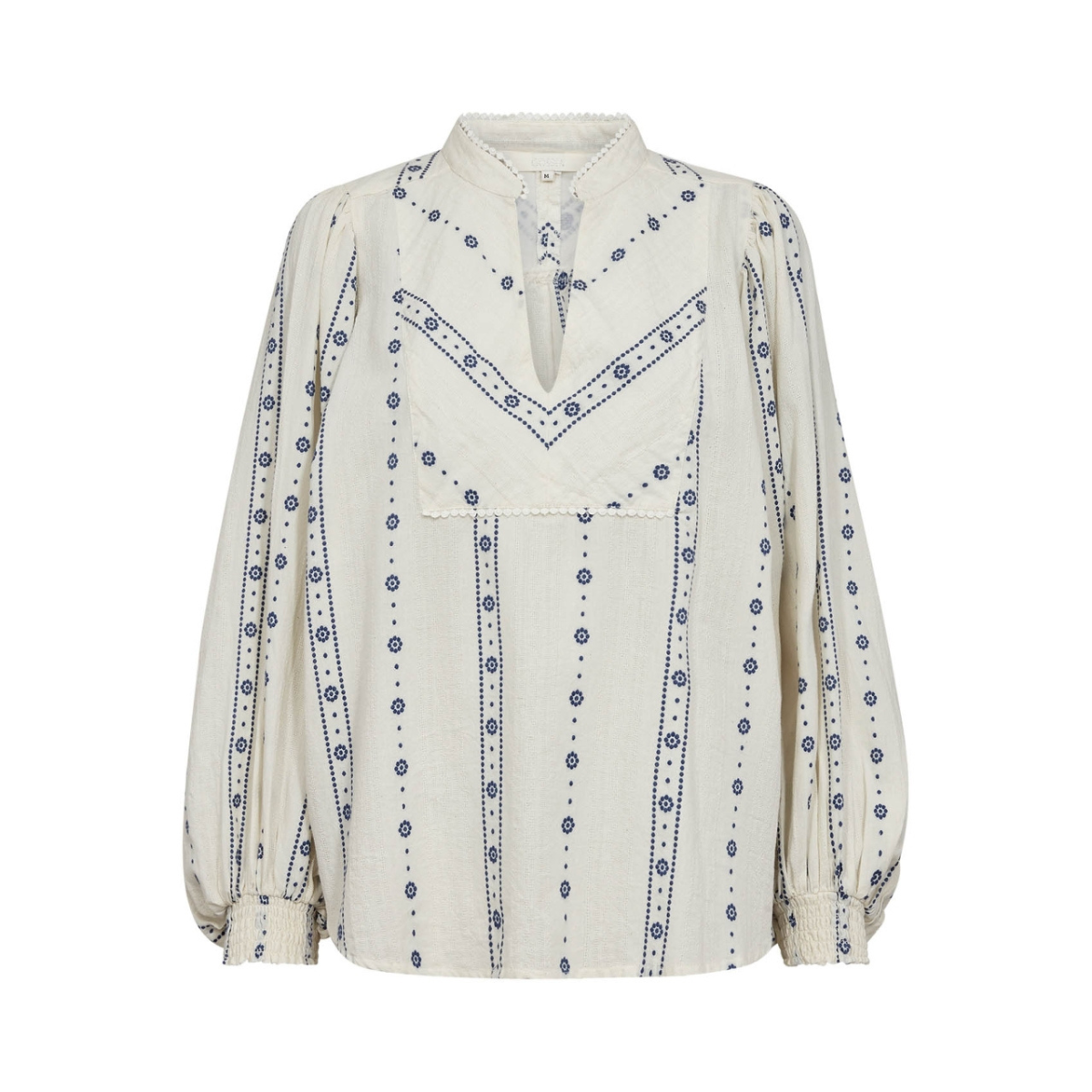 Smuk bluse fra Gossia. Blusen har V-udskæring, smock ved ærmerne samt en luftig pasform. Derudover har den et flot mønster fordelt på hele blusen.