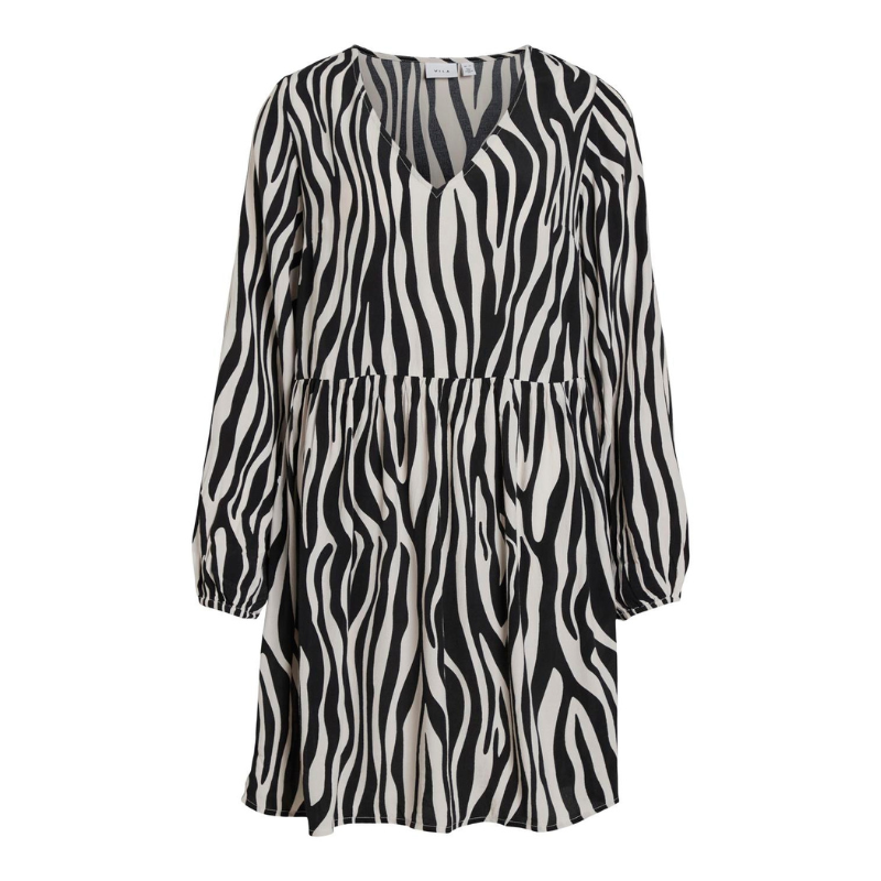 Skøn kjole fra Vila. Kjolen har V-udskæring, lange ærmer med elastik og et cool print.