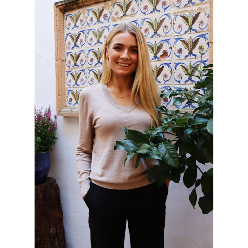 Super sød pullover strik fra Liberté. Den har V-hals, lange ærmer, en normal pasform og ribkantsdetaljer ved alle afslutninger. Materiale: 80% Viskose. 20% Polyamid. Vaskeanvisning: Vaskes ved 30 grader.