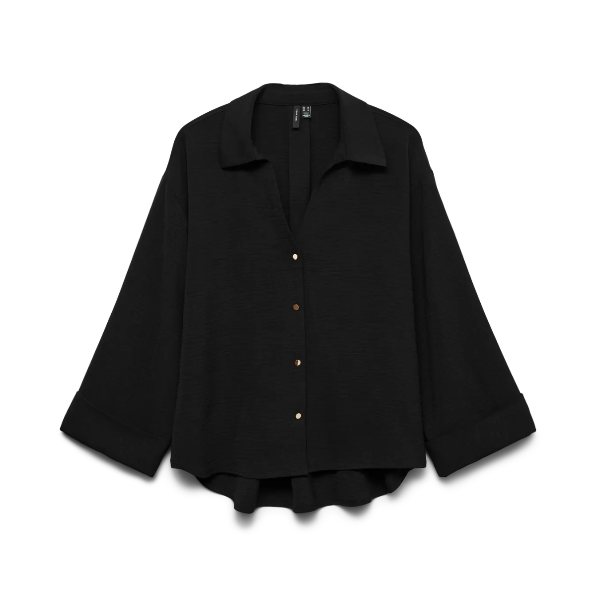 Super flot skjorte fra Vero Moda. Skjorten er gennemknappet med flotte guldknapper, har V-udskæring, skjortekrave samt brede ærmer.