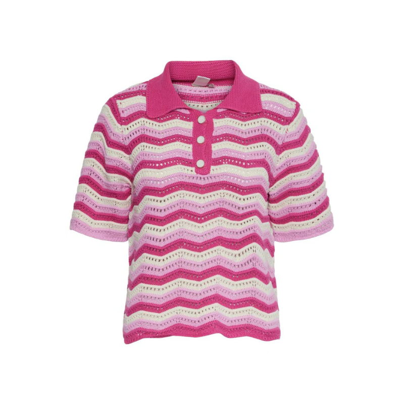 Super sød strik fra YAS. Strikken har skjortekrave, korte ærmer samt tre knapper ved halsen. Deruover har den et fint mønster med flotte farver.